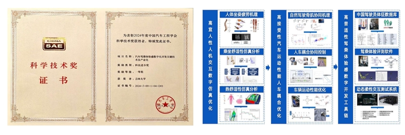 “汽车驾乘体验感数字化开发关键技术及产业化”项目由吉林大学牵头,联合一汽解放汽车有限公司、重庆长安汽车股份有限公司、中汽信息科技(天津)有限公司、赢富仪器科技(上海)有限公司等单位共同完成。项目团队自2009年起,在国家重点研发计划、国家自然科学基金、省部级科技项目及行业重大工程任务等一批项目支持下,创新性建立了汽车驾乘体验感数字化设计开发理论方法新体系,发明了汽车高宜人性人机交互数字仿真优化技术,提出了人机耦合设计的高接受性汽车运动控制性能优化方法,构建了基于数字骨肌生理学模型的汽车行驶体验感测试方法及系统。通过项目研究,突破了高仿生逼真度、高主客观一致性的驾乘体验数字化设计开发的国际难题。项目所形成的多项关键技术指标达到国际先进水平。相关成果在一汽、长安等国内车企产品开发中得到应用,匹配解放J7、长安UNI-V等自主品牌车型50余款。显著改善了产品驾乘体验水平,相关技术的应用大大缩短产品研发周期。部分技术推广应用于海外北美福特、日本鸟取,取得了显著的社会经济效益与国际声誉。