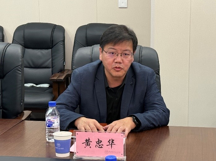 黄忠华书记随后致辞,对参会人员进行逐一介绍,希望学院研究方向与东风汽车集团研发总院的科研需求能够紧密结合。他结合我院实验室的建设情况,对学院的科研工作与学生实习实践的开展成效进行了详细讲解。