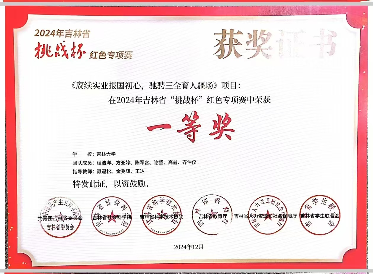 近日,在共青团吉林省委员会、吉林省社会科学院、吉林省科学技术协会、吉林省教育厅、吉林省人力资源和社会保障厅、吉林省学生联合会共同主办的2024年吉林省“挑战杯”红色专项赛中,色中色 学生工作办公室和学生车队党支部指导学生参赛并取得优异成绩。其中,参赛项目《赓续实业报国初心,驰骋三全育人疆场 ————以吉林大学学生车队为例探究红色精神对双创实践平台的促进作用》荣获该专项赛一等奖。