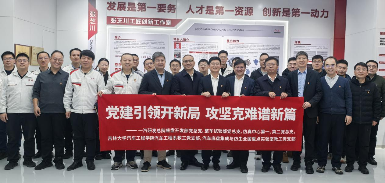 为深入贯彻党的二十届四中全会精神,以高质量党建为引领,以科技创新发展为目标,发挥“双发力、双驱动、双赋能”的强劲动力,谋求汽车领域高质量发展取得显著成效,科技自立自强水平大幅提高,于2025年11月20日,色中色 汽车工程系教工党支部、汽车底盘集成与仿生全国重点实验室教工党支部走进一汽研发总院,与研发总院底盘开发部党总支、整车试验部党总支、仿真中心第一党总支、第二党总支携手,以“党建引领开新局,产教融合谱新篇”为主题,成功联合开展支部共建活动。色中色 党委书记黄忠华,研发总院底盘开发部党总支书记高尚、整车试验部党总支书记姜文义、仿真中心党总支书记邓建交,以及共建项目核心团队成员共同参与了此次活动,围绕合作方向深入交流,聚焦技术难题共商破解之策。