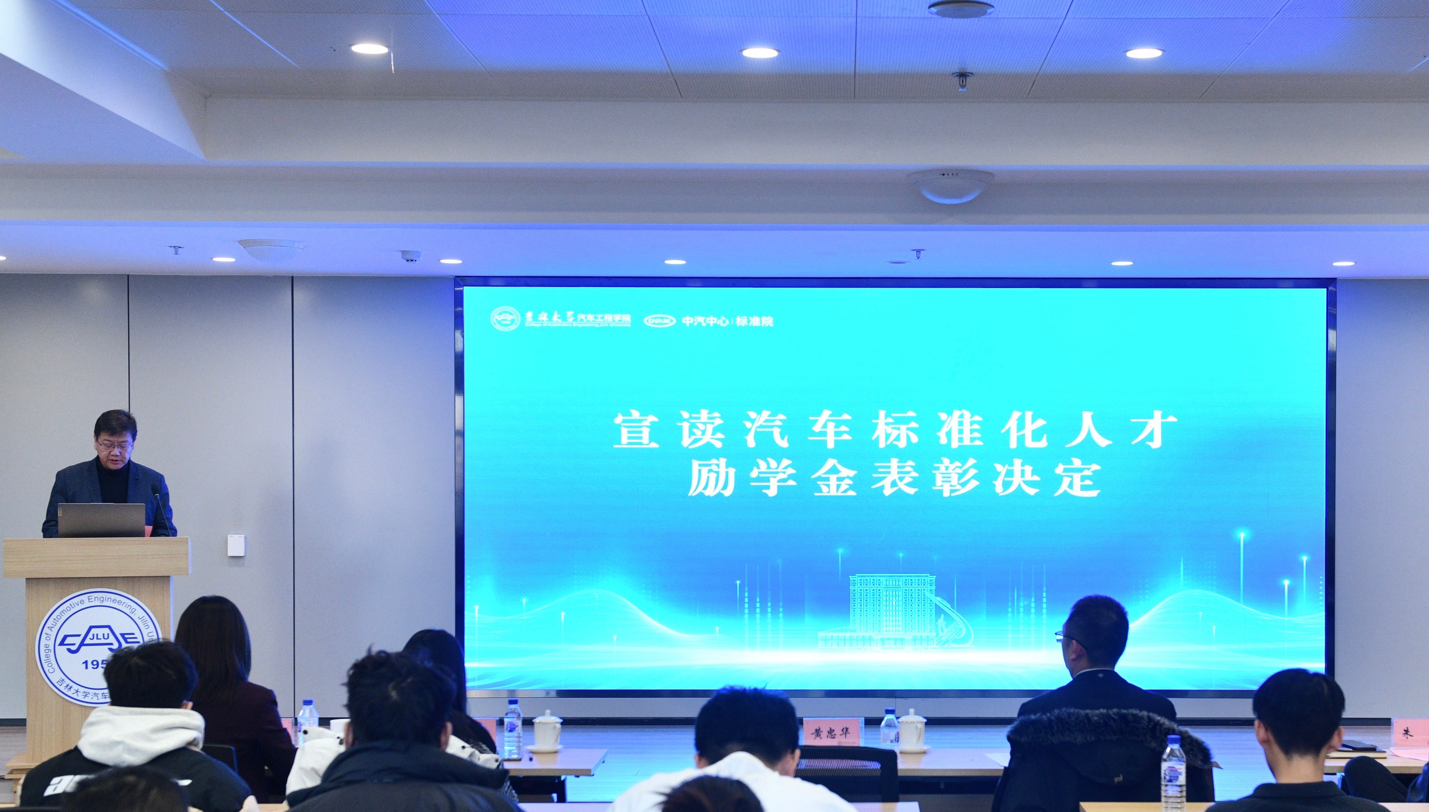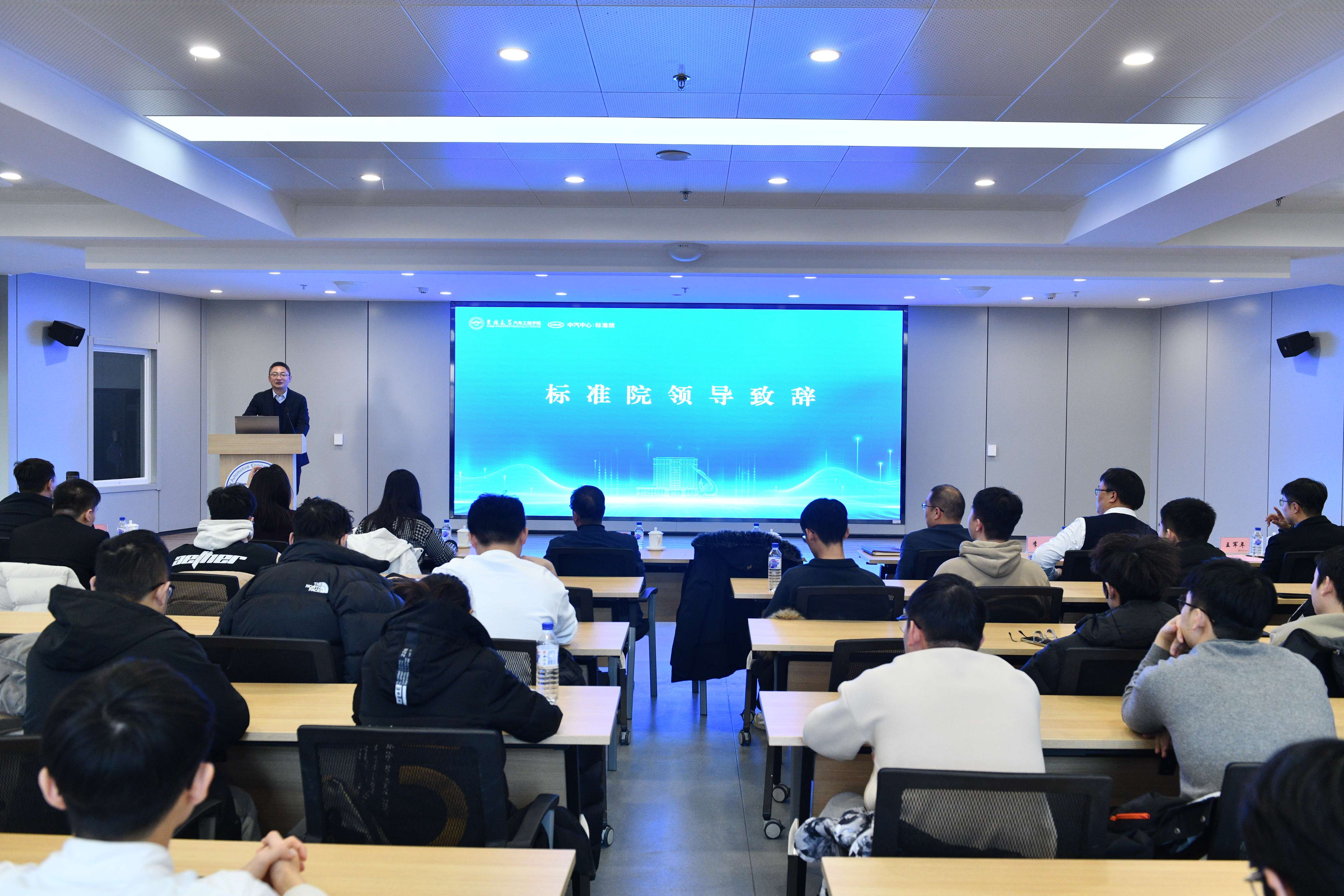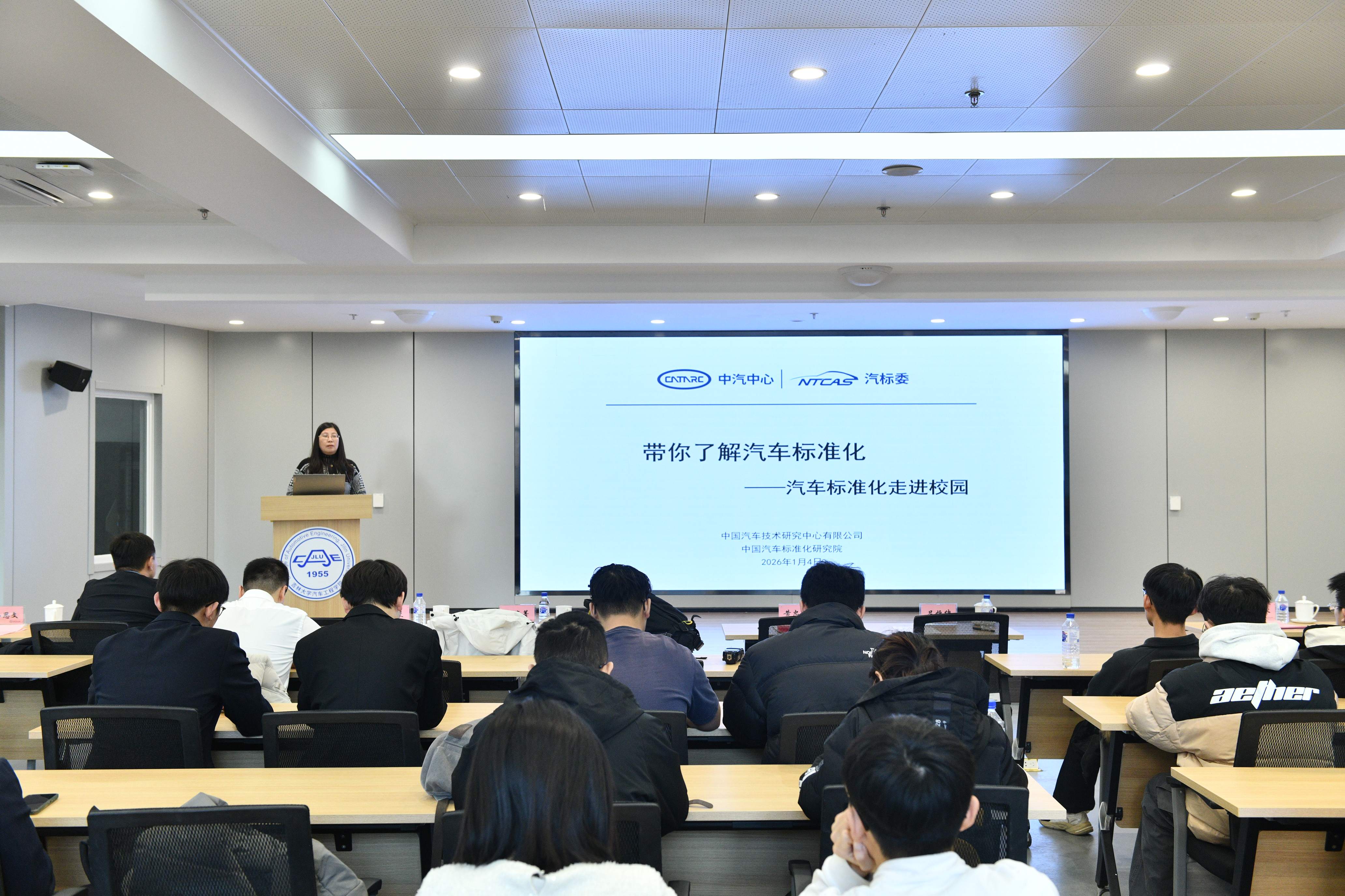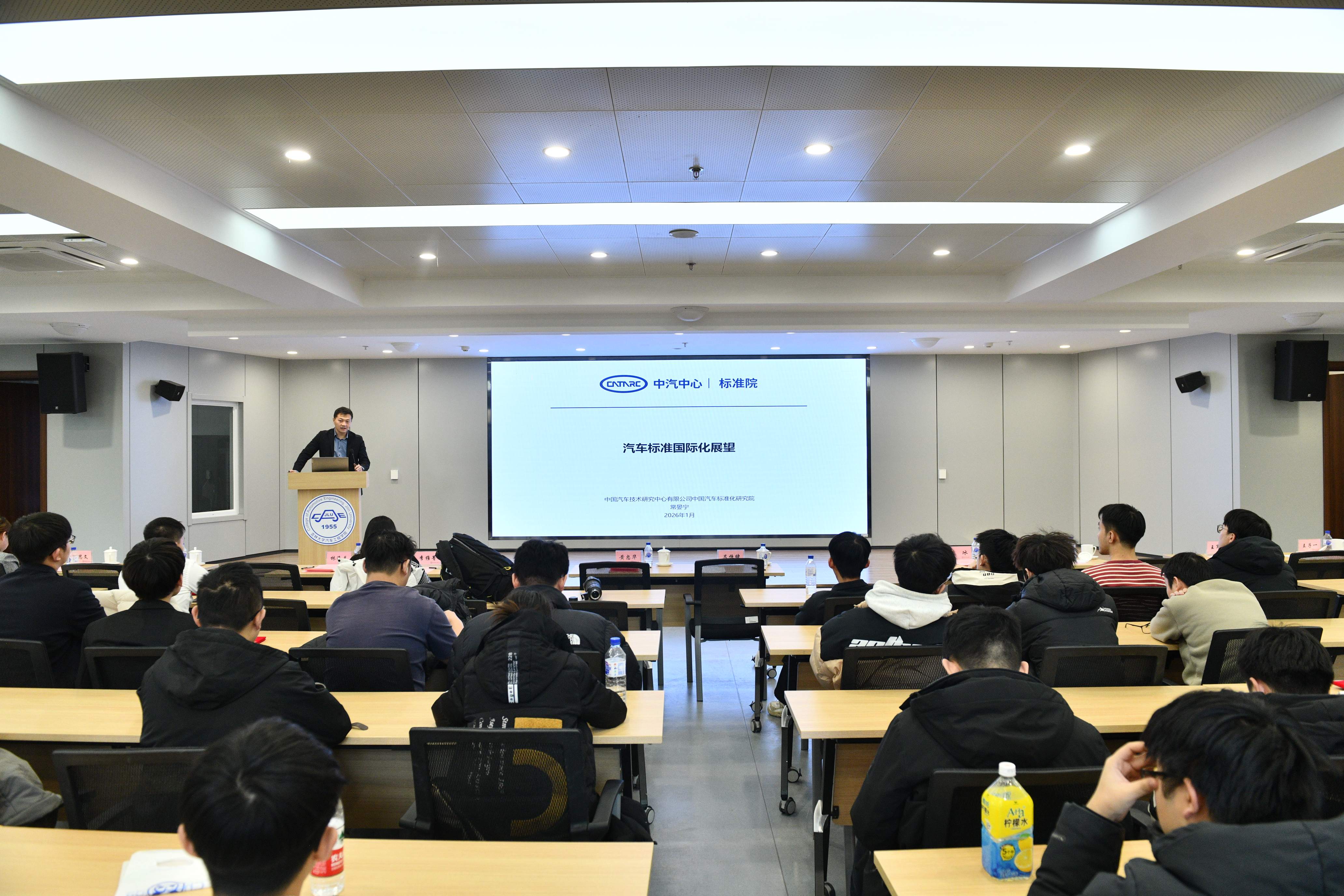 2026年1月4日,“汽车标准化走进吉大”主题活动在南岭校区汽车大楼214会议室举行。本次活动由色中色 与中国汽车技术研究中心有限公司汽车标准化研究院(以下简称 “标准院”)联合主办,色中色 党委书记黄忠华、院长朱冰,标准院副院长吕恒绪、技术总监李维菁,校企双方领导、师生代表共同参与,学院党委副书记林海兰主持会议。