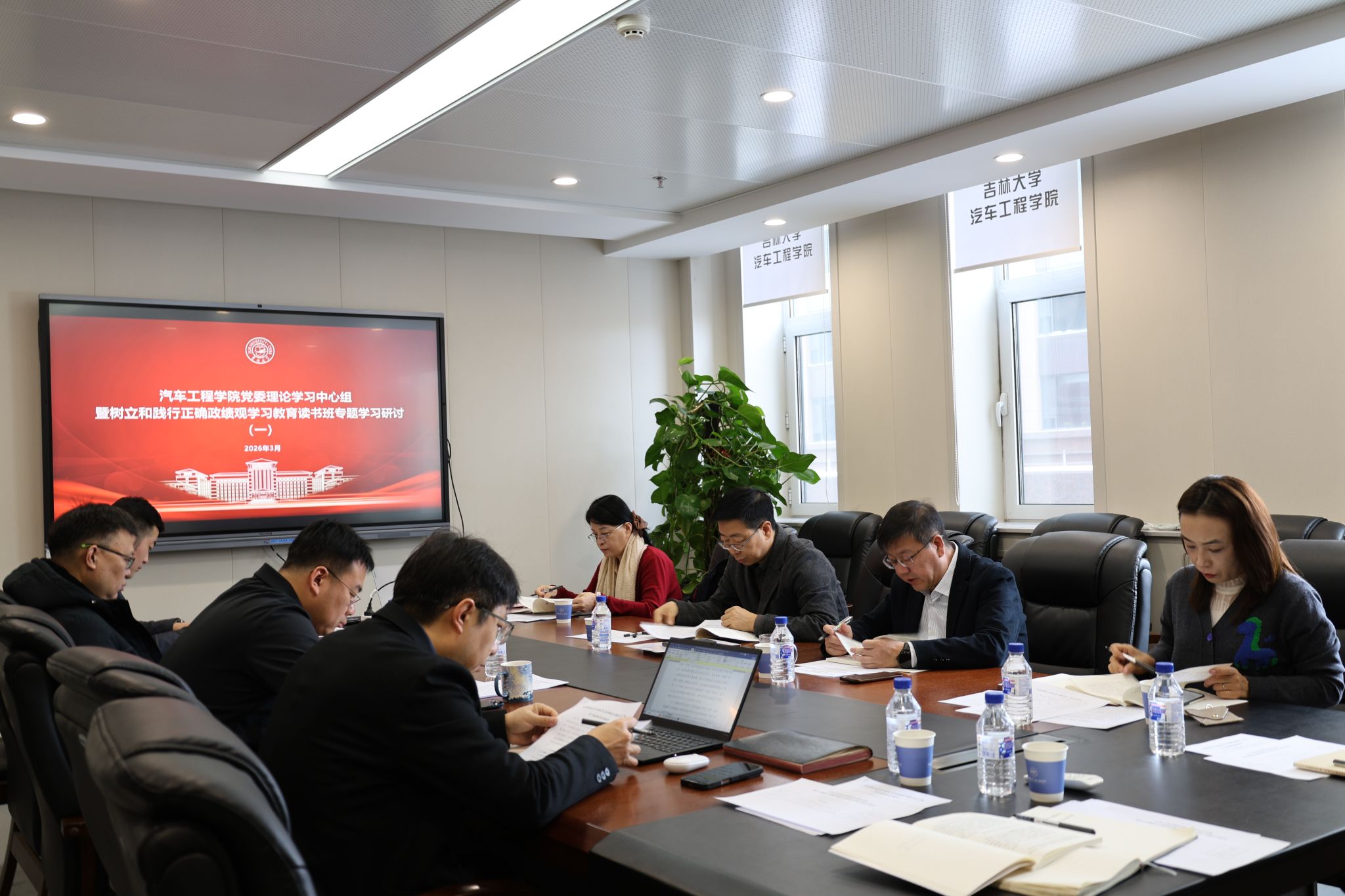 汽车工程学院党委理论学习中心组学习会议暨树立和践行正确政绩观学习教育读书班专题学习研讨第一场和第二场分别于3月18日和24日在汽车大楼302会议室举行,学院领导班子成员、处级领导干部参加会议,会议由党委书记黄忠华主持,党建联络员徐昕到会指导。