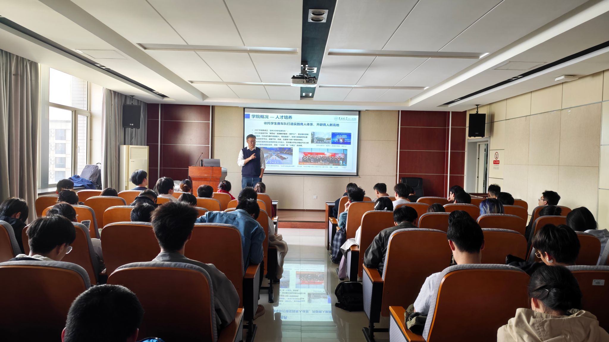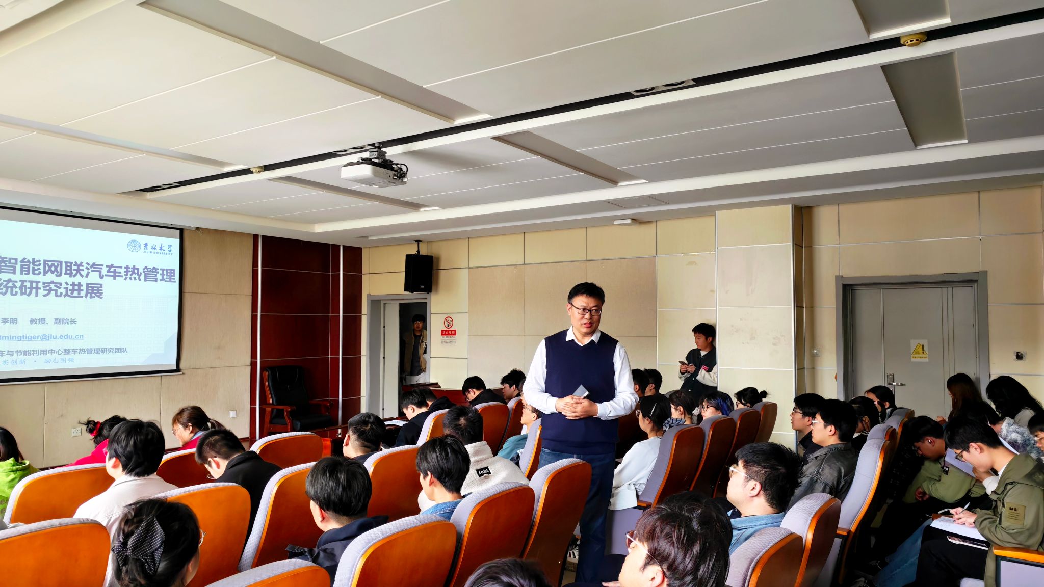 报告结束后,李明教授围绕色中色 的研究生培养特色开展招生宣讲。他介绍了学院从学士到博士后的完整人才培养体系,重点解读了2026年车辆工程、动力工程及工程热物理等学科的招生计划、导师团队及科研方向,展示了学院在智能网联汽车、新能源汽车、集成式热管理系统等领域的科研平台与成果。