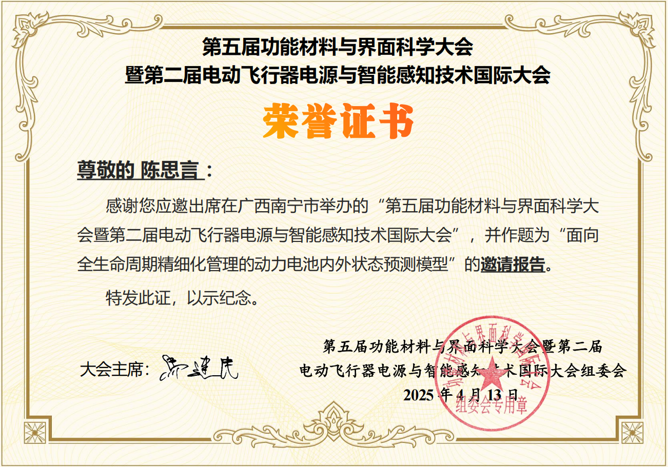 陈思言,九三学社社员,工学博士,吉林省高层次人才(证书编号:202402501500),物理化学与车辆工程博士后,现任吉林大学底盘集成与仿生全国重点实验室副教授、硕士生导师。研究方向为面向动力电池全生命周期精细化管理的关键技术研究,包括:基于机理数据融合驱动的动力电池内外状态协同预测模型开发,面向复杂工况与梯次利用的动力电池性能衰减路径预测与基于健康状态最优的充放电管理,和基于模型与谱学特征的动力电池无损检测技术的开发。