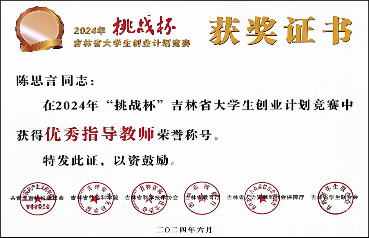 吉林大学挑战杯“优秀指导教师”荣誉称号